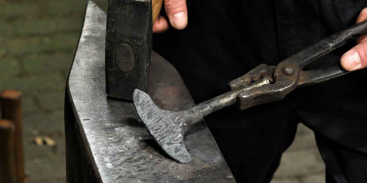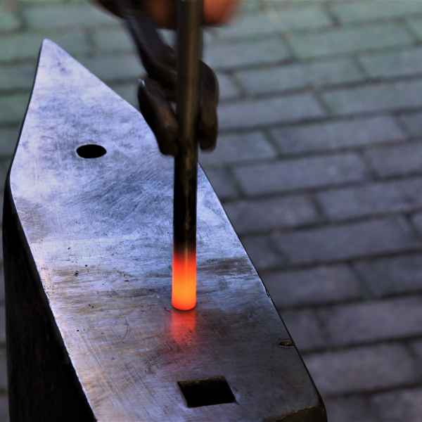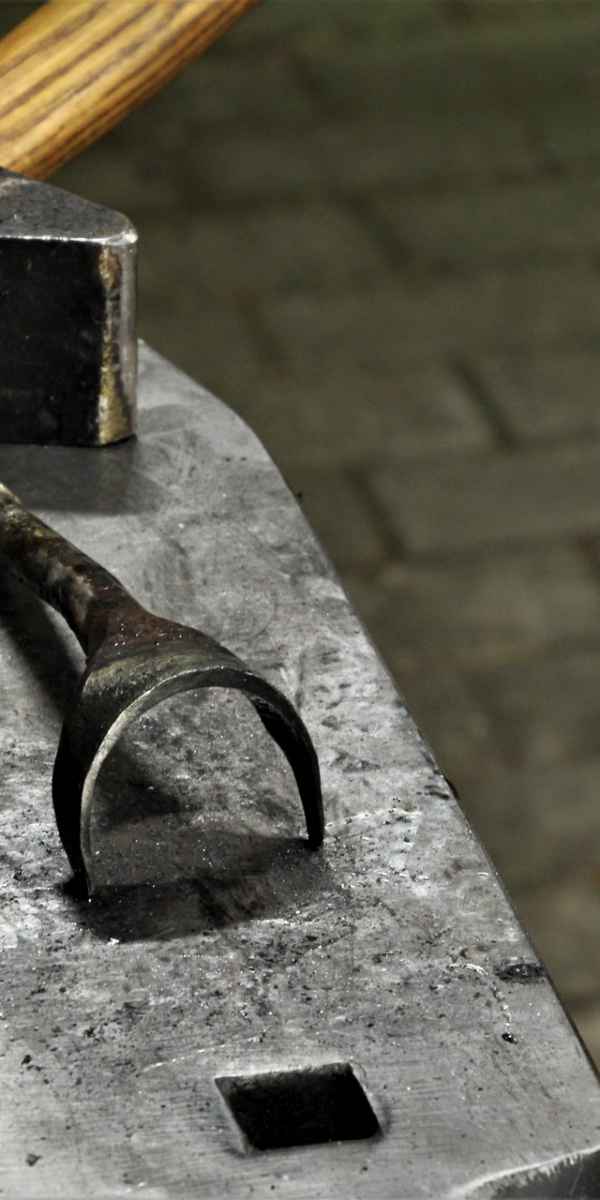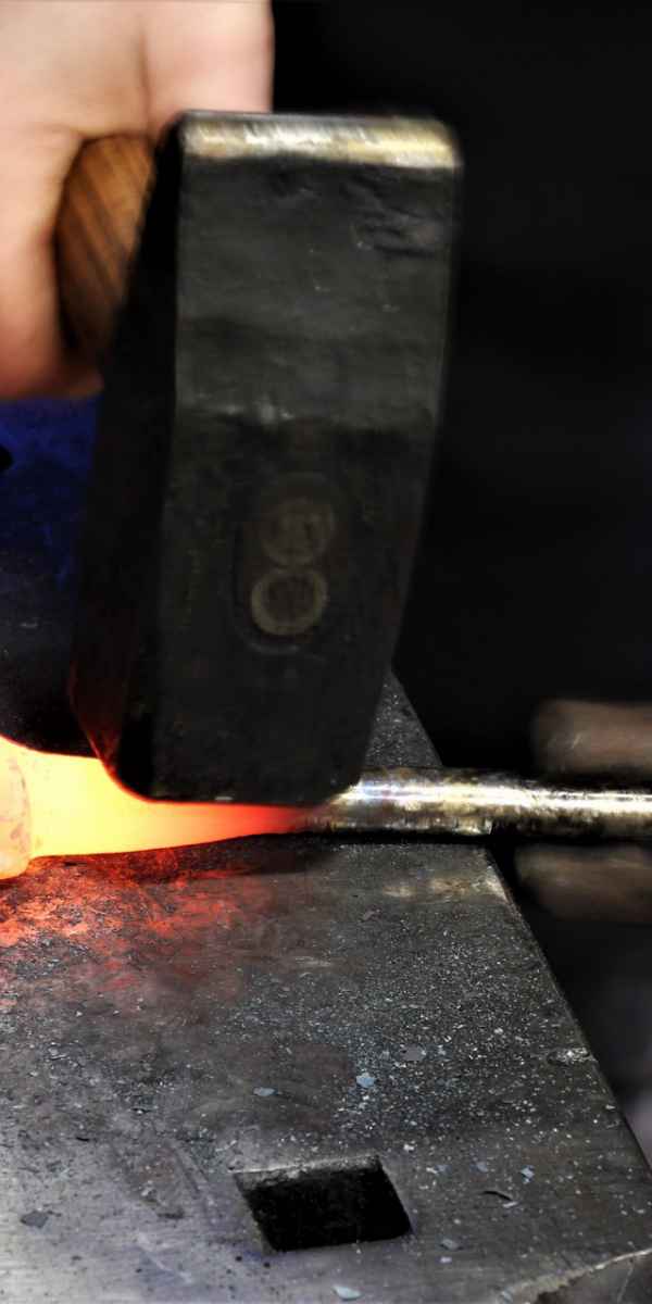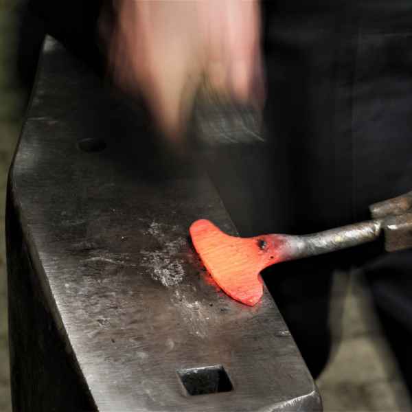 An dem Wochenende wurde an beiden Tagen geschmiedet. Ich durfte den Vorschlaghammer führen und… „Wie hältst Du denn den Hammer? Willst Du mich umbringen? So geht das!“ – und dann wurde mir gezeigt, wie ich den Hammer zu halten hatte: Die linke Hand kommt unter den rechten Arm. Aha. So „verbogen“ sollte ich dann gleich wenige Zentimeter am Kopf des Meisters vorbei zuschlagen. Damit muss ich dann auch erst noch warm werden.